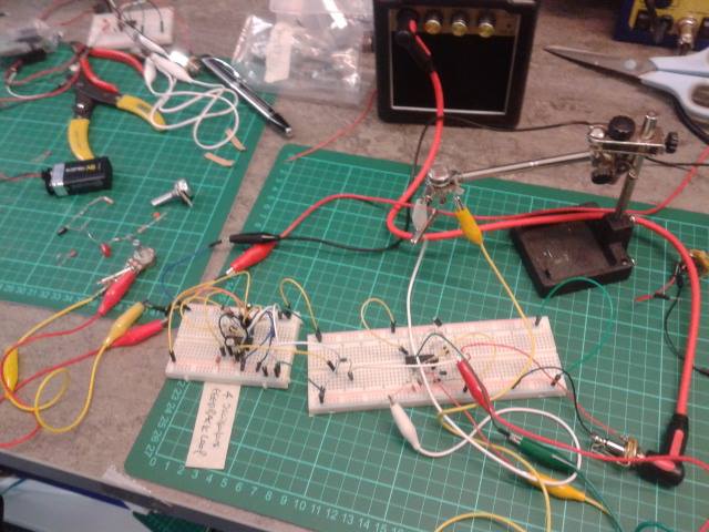 For Arts+Tech we are creating a series of noise circuits to explore the types of sounds and effects we would like to be in our final noise machine. Using the 4093 or NAND IC chip we are experimenting with gating multiple oscillators (from one chip) signals at particular frequencies thereby setting the tonal range we want to work with. This is helpful to gate out the very high squeeling frequenices that quickly move out of audible range. Another test is with feedback, taking the output from one oscillator and sending this to the input of another this creates very interesting patterns. When we left these drone oscillators playing over a period of time, the effect was of them ‘playing themselves’, with chaos and chance elements occurring …. very exciting!