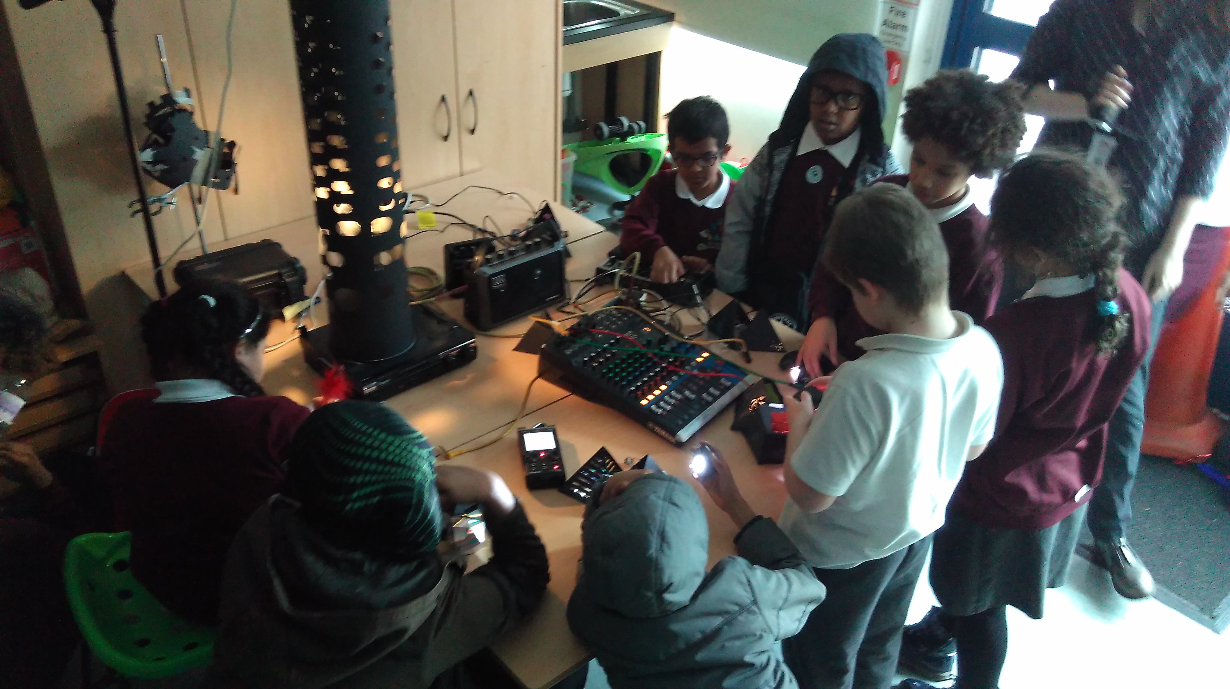 Back at our favourite school… Webster Primary school this April working with the KS2 students to make electronic noise machines and their own sculptures. Each week we had a new experiment from jumping jack mobile phone vibrating drums to playing the music from the class room tap. We also ran listening excercises using the Greater Manchester Sound Archive samples and wonderful sound drawing activity. For the final session the group finished their noise machines and we improvised with them as a class orchestra (including space echo!) Thanks to Mr Jackson and all the children, so much fun.