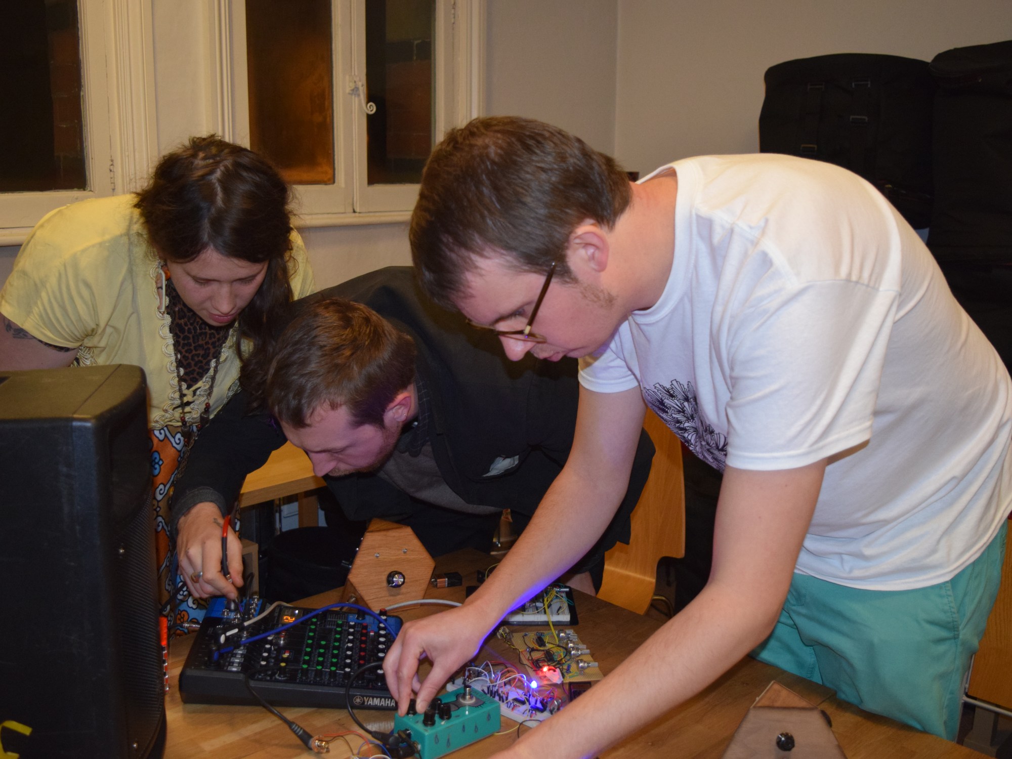 Our third Manchester focus group at Brighter Sound was lots of fun, with a third set of new people interested in our Noise Machine project. We were able to show the group some new circuit designs including the VCO-LFO-LPF setup and some early tests for drum circuits. The group had some fantastic suggestions and discussion points, one which was particularly interesting was around the element of control in performance. For example if you found an particular timbre or sound you wanted to loop or hold, would this be possible (sample and hold circuitry …) and is there a possibility for the light option to be switchable so that if you were recording and wanted reproduce a particular sequence of events or sounds you were able to do this and record. Participants all commented on how fun and exciting they found the light element and the playability, one member who had been playing synthesizers for 20 years had never seen the inside of these electronic instruments and particularly interested to see how they worked. We also discussed the potential of creating randomised poly rhythms but also having the option to sync or combine steady rhythms with more random sounds over the top .. ‘chaos option’ one member describing this as having ‘sense in the rhythm but chaos on top’.Here’s a sound file of the groups discussion. Thankyou!
