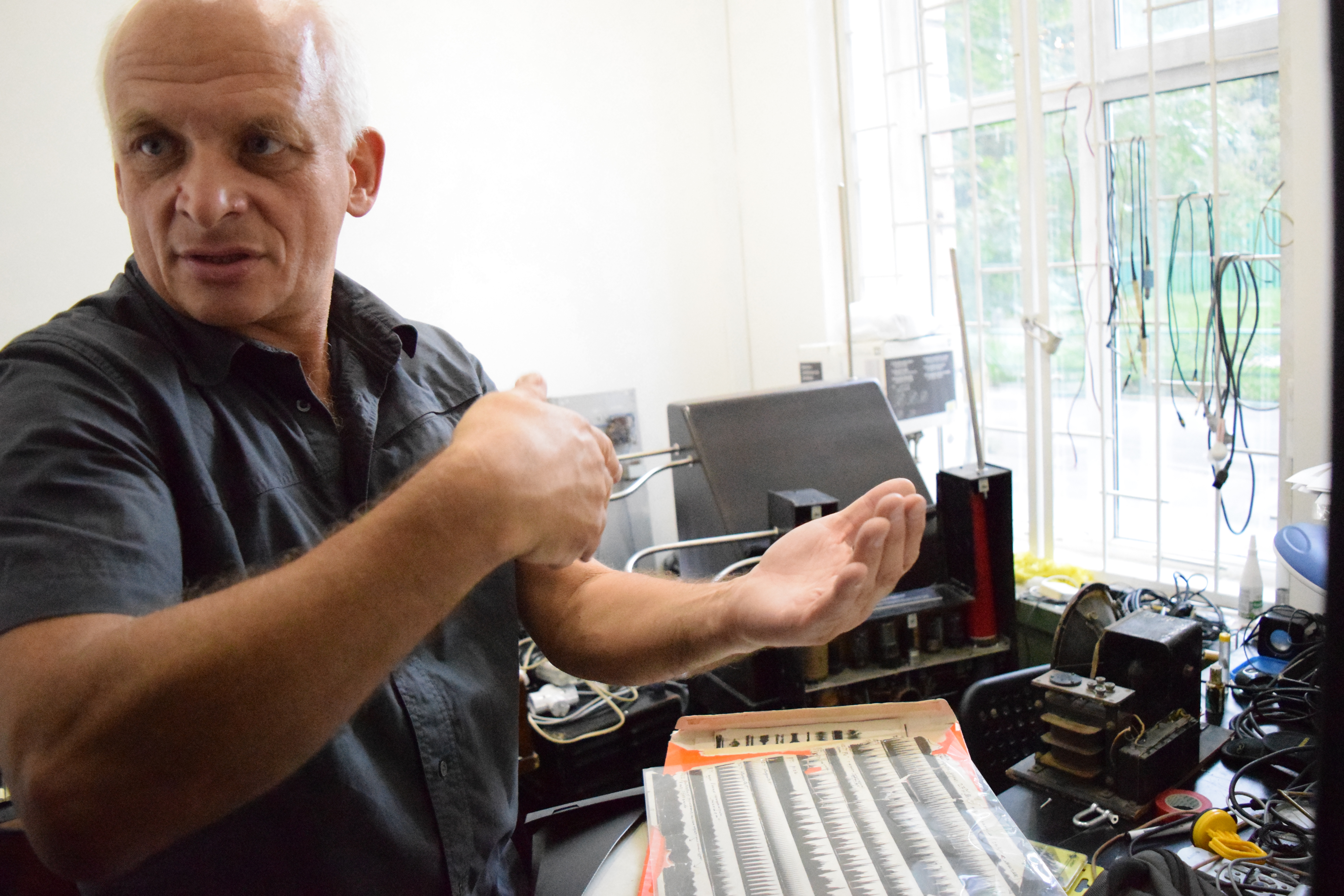 In August 2015 we embarked on research trip to Moscow to uncover the stories behind this group of artists and scientists and see the noise machine objects and archival graphical scores. The trip was part of our research for the ‘Play the Collections’ residency at the National Science and Media Museum, one aim was to film and record sounds and imagery that would feed into our final show at the museum. Having contacted Andrey Smirnov who kindly said he would meet us in Moscow- this was a huge adventure!